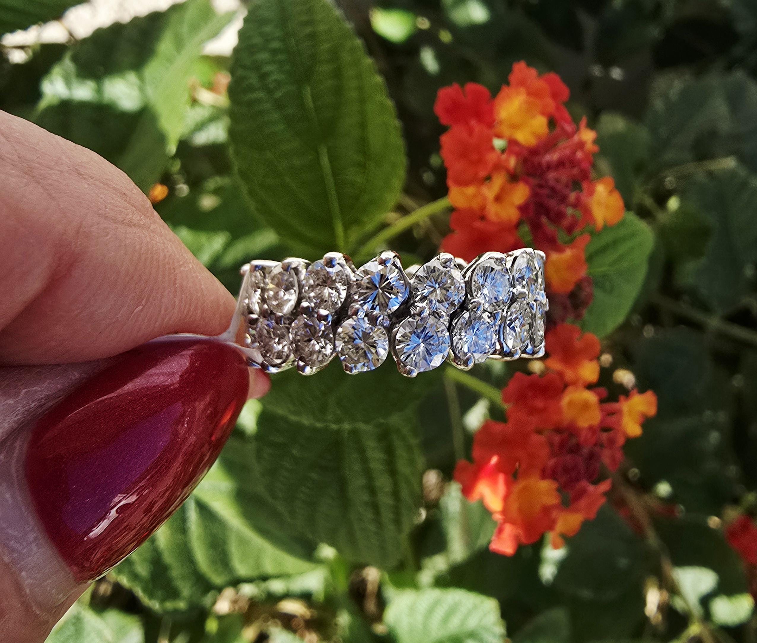 Stunning Platinum 2-Row Diamond Eternity Band in size 6. This well-made, high class, 2-row diamond eternity ring has a total of 34 natural (earth-mined) round brilliant cut diamonds that have a total diamond weight of approximately 7.00 carats total weight. The diamonds have a Color Grade: G-H, Clarity Grade: VS-VS2. Sorry, but this ring cannot be sized.