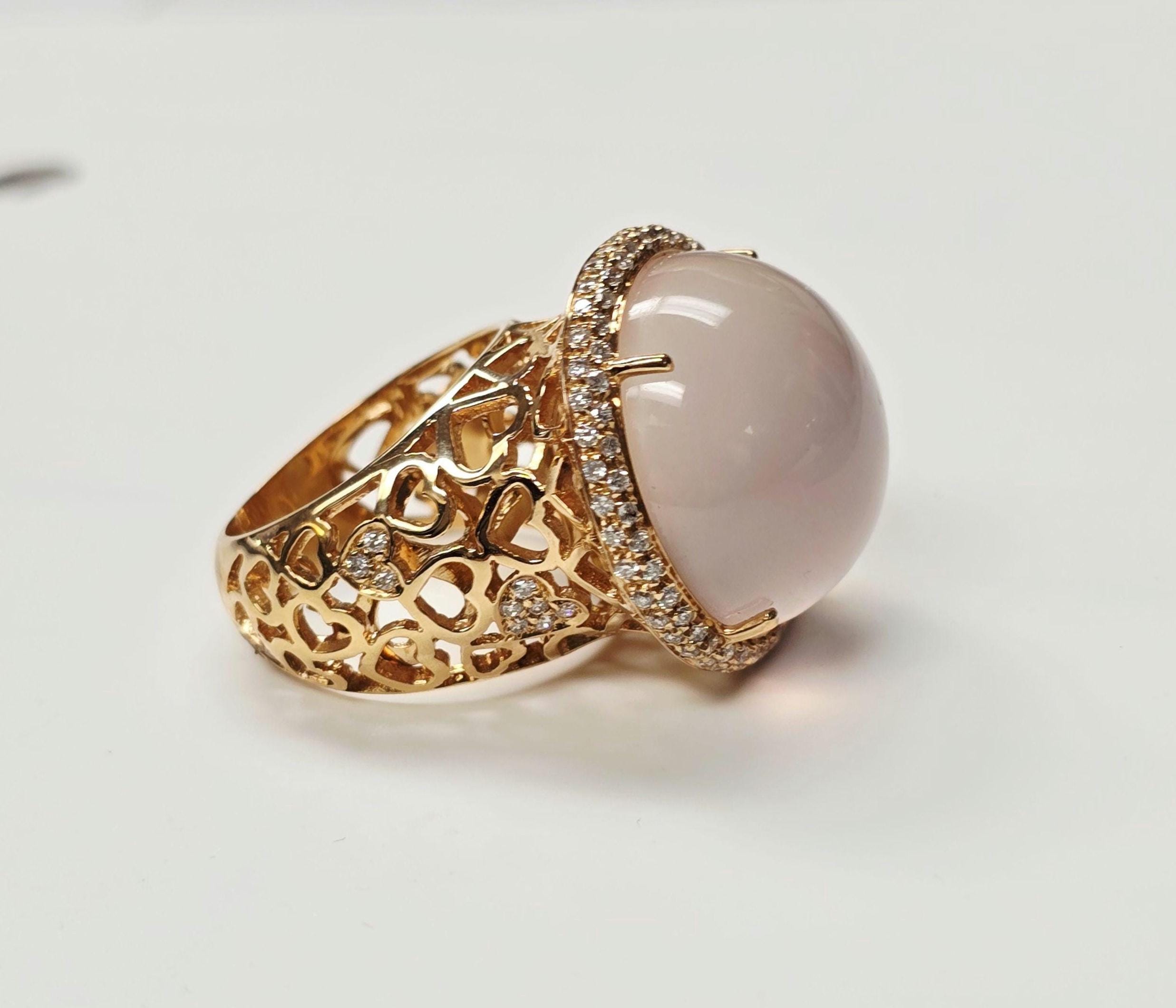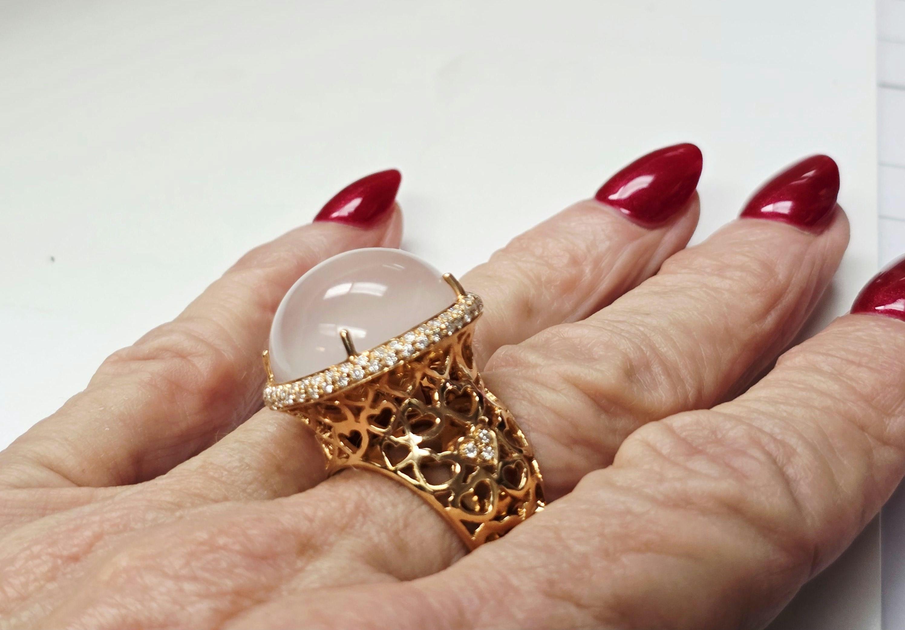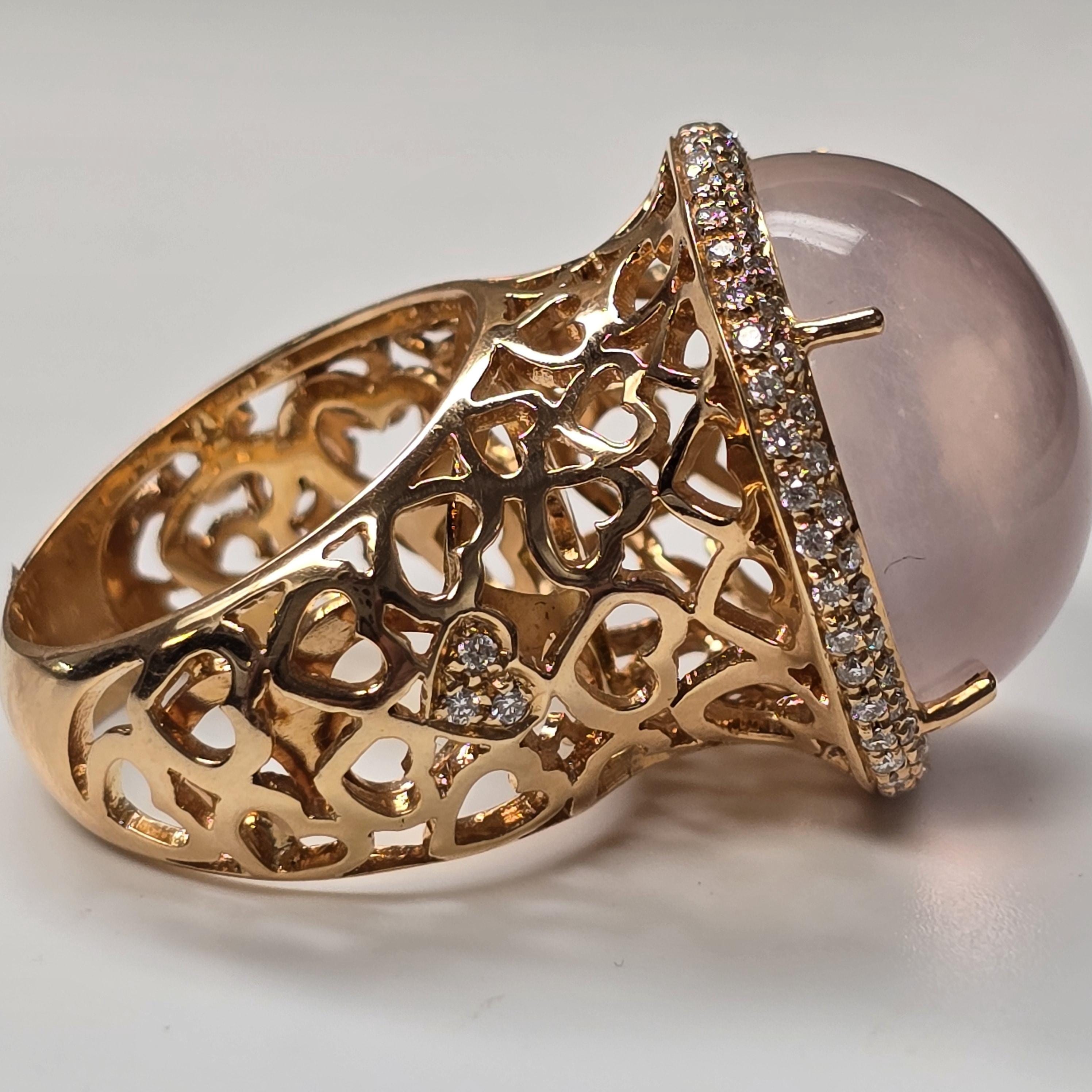 SUPER FINE MOONSTONE RUNG SET IN 18K ROSE GOLD "HALO" STYLE MOUNTING WITH APPROX 1.00CTW OF DIAMONDS. SHANK OF RING HAS "HEART MOTIF" DESIGNS ALL OVER.