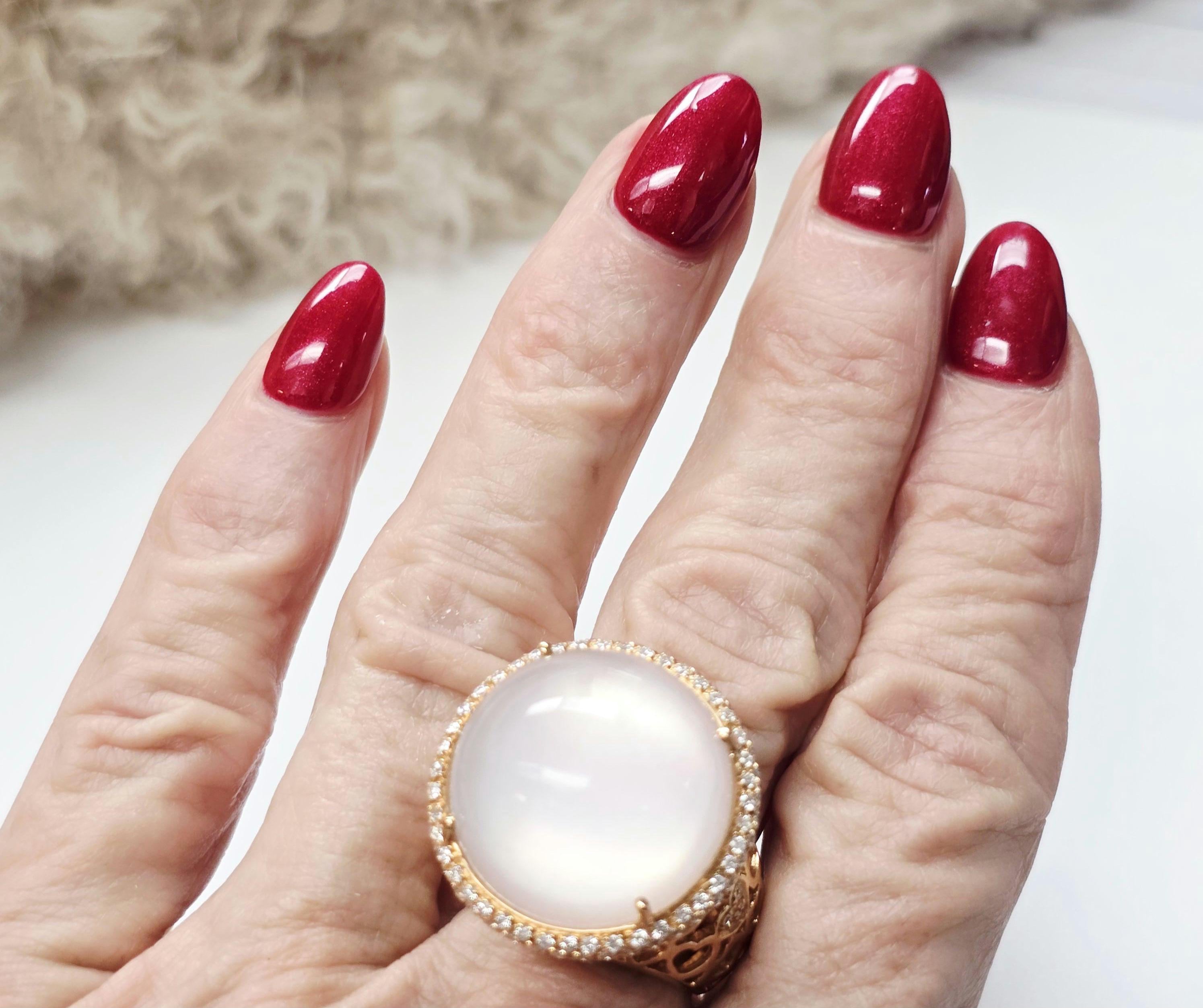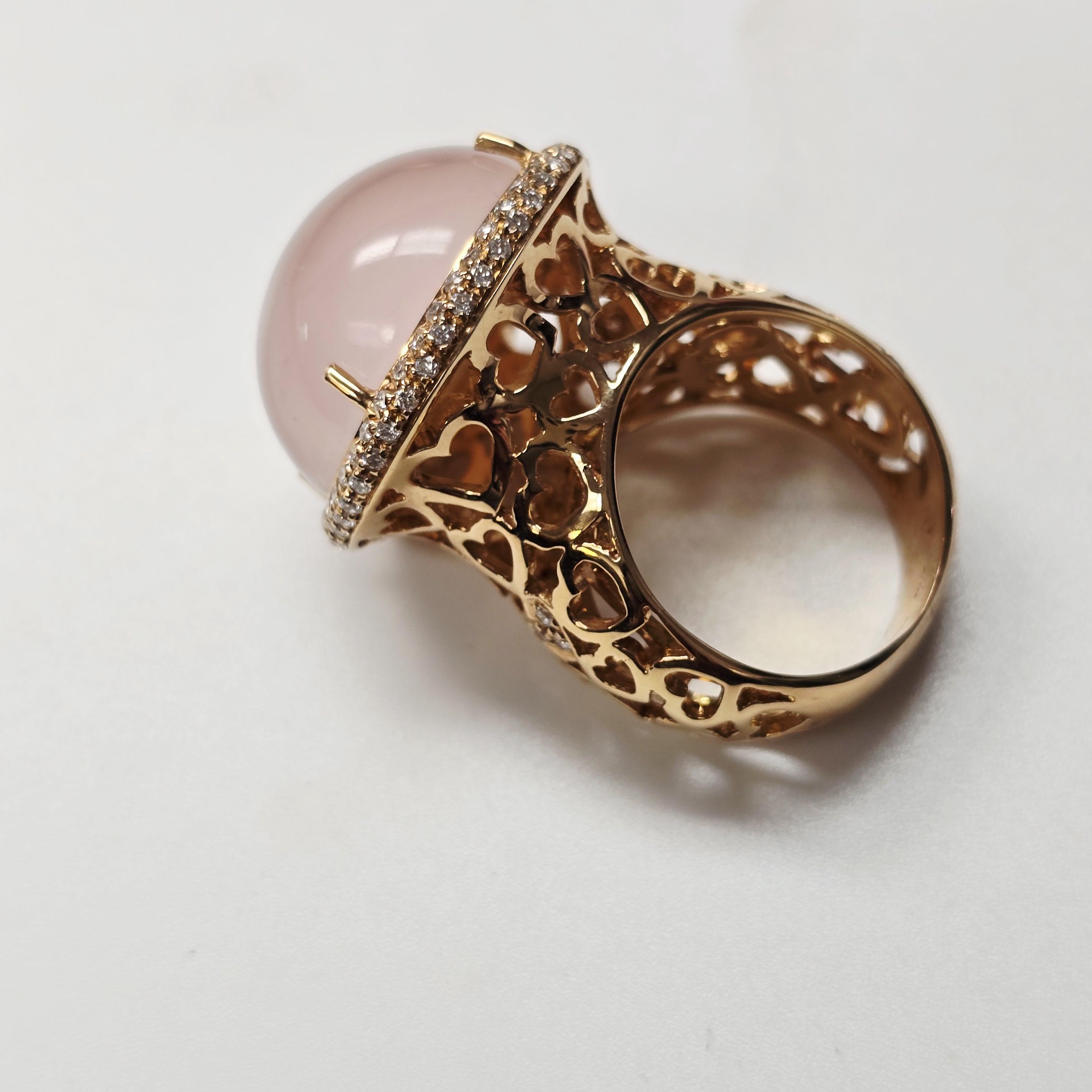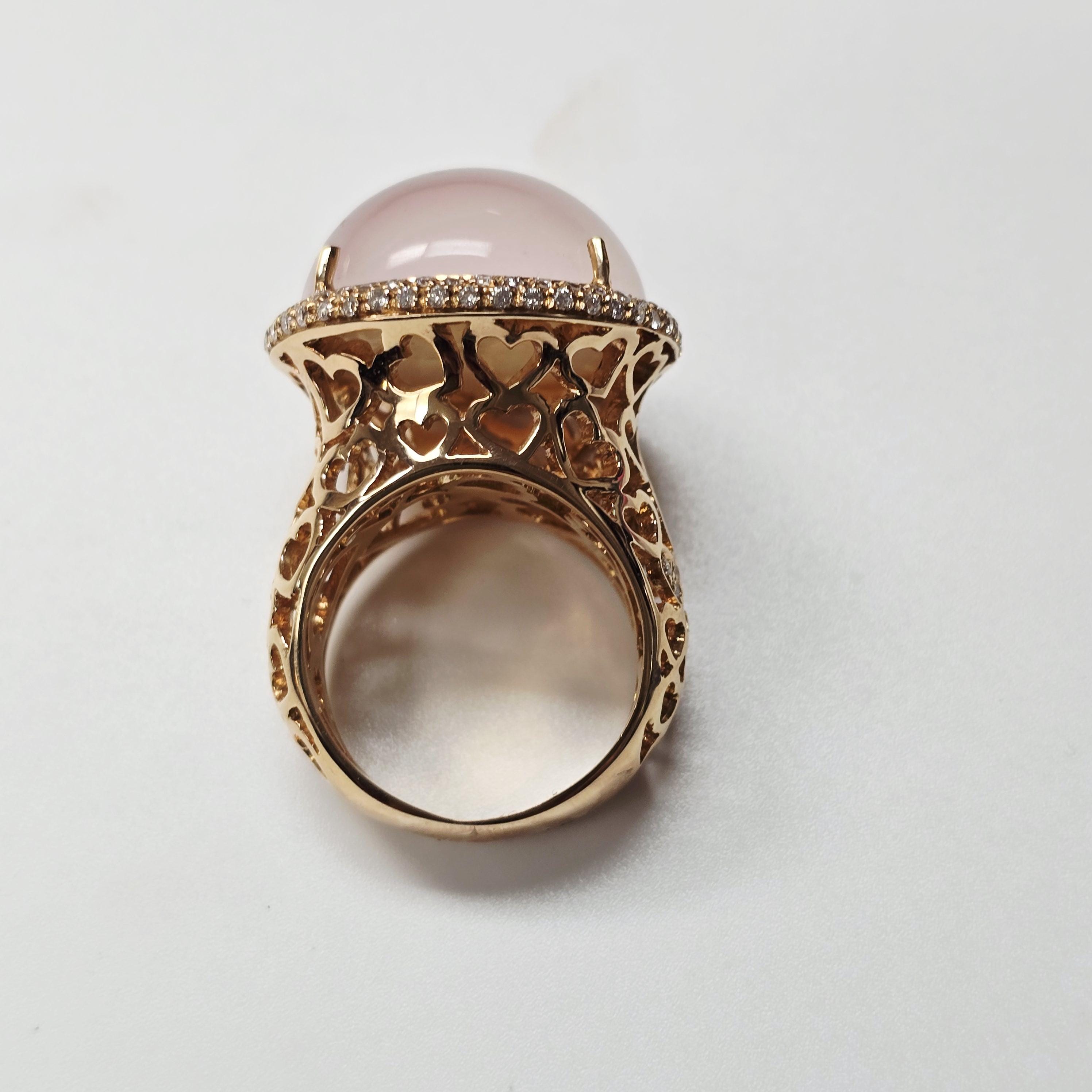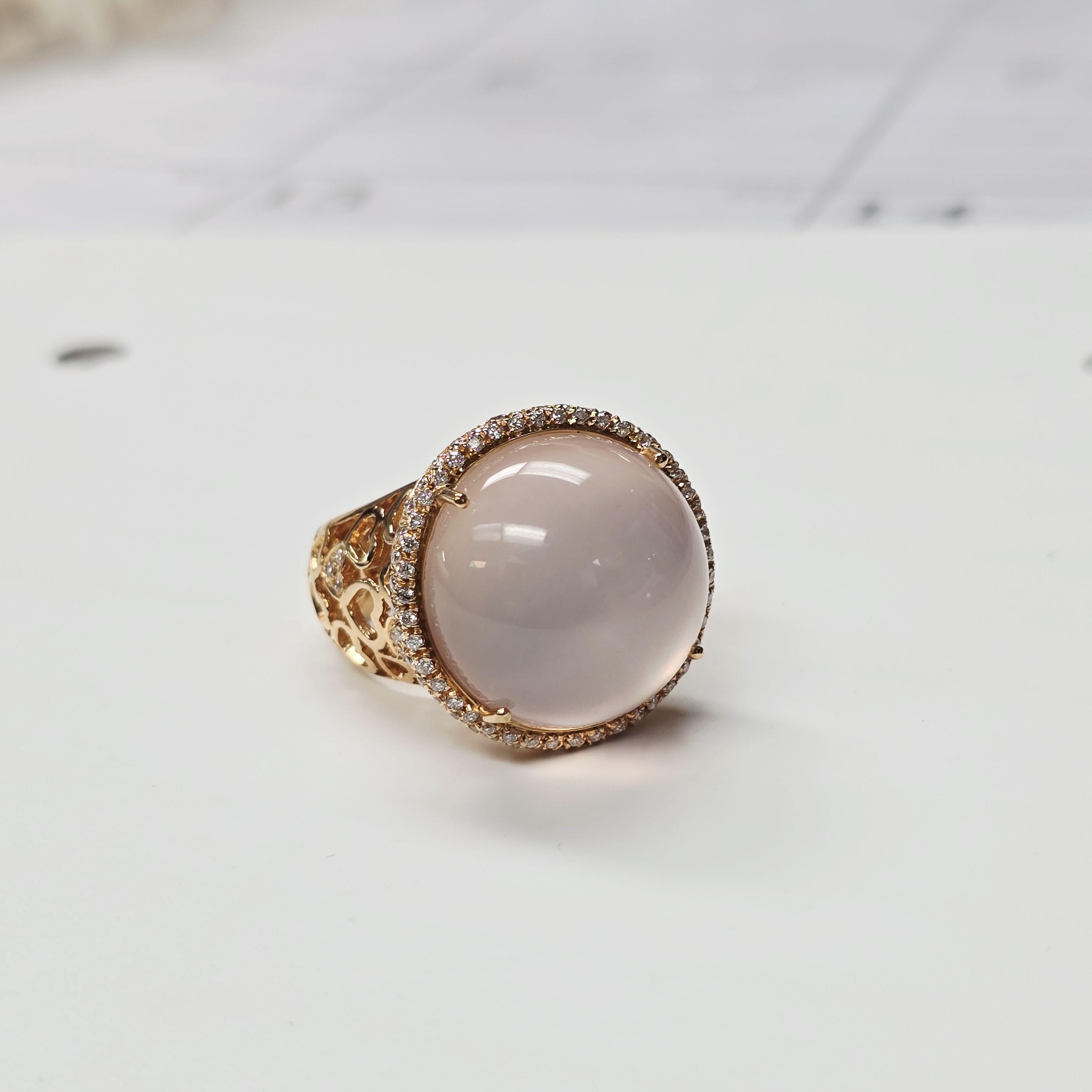 SUPER FINE MOONSTONE RUNG SET IN 18K ROSE GOLD "HALO" STYLE MOUNTING WITH APPROX 1.00CTW OF DIAMONDS. SHANK OF RING HAS "HEART MOTIF" DESIGNS ALL OVER.