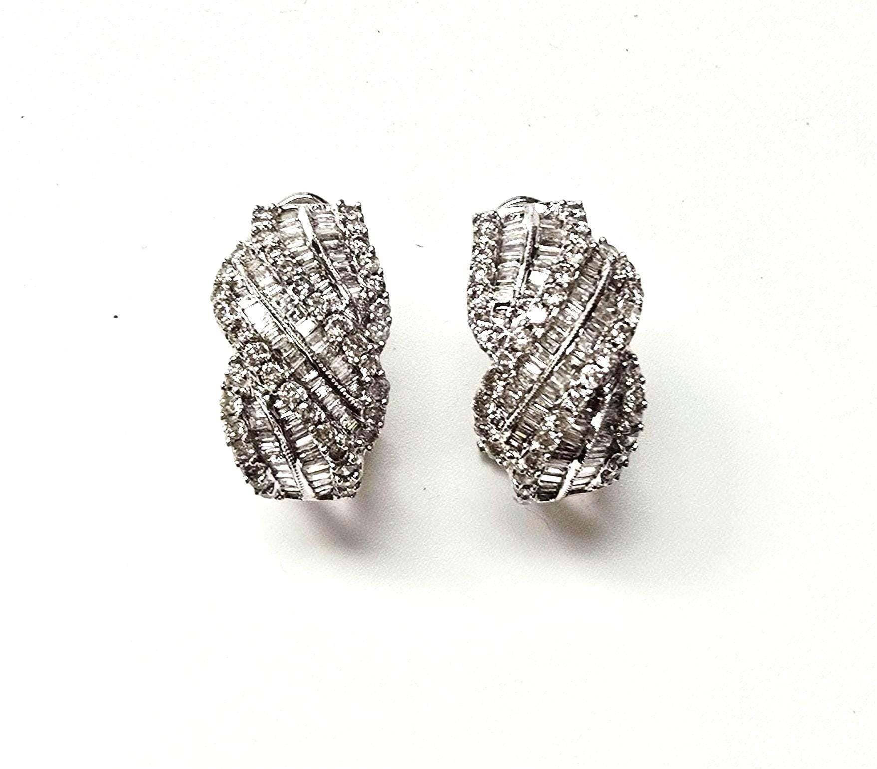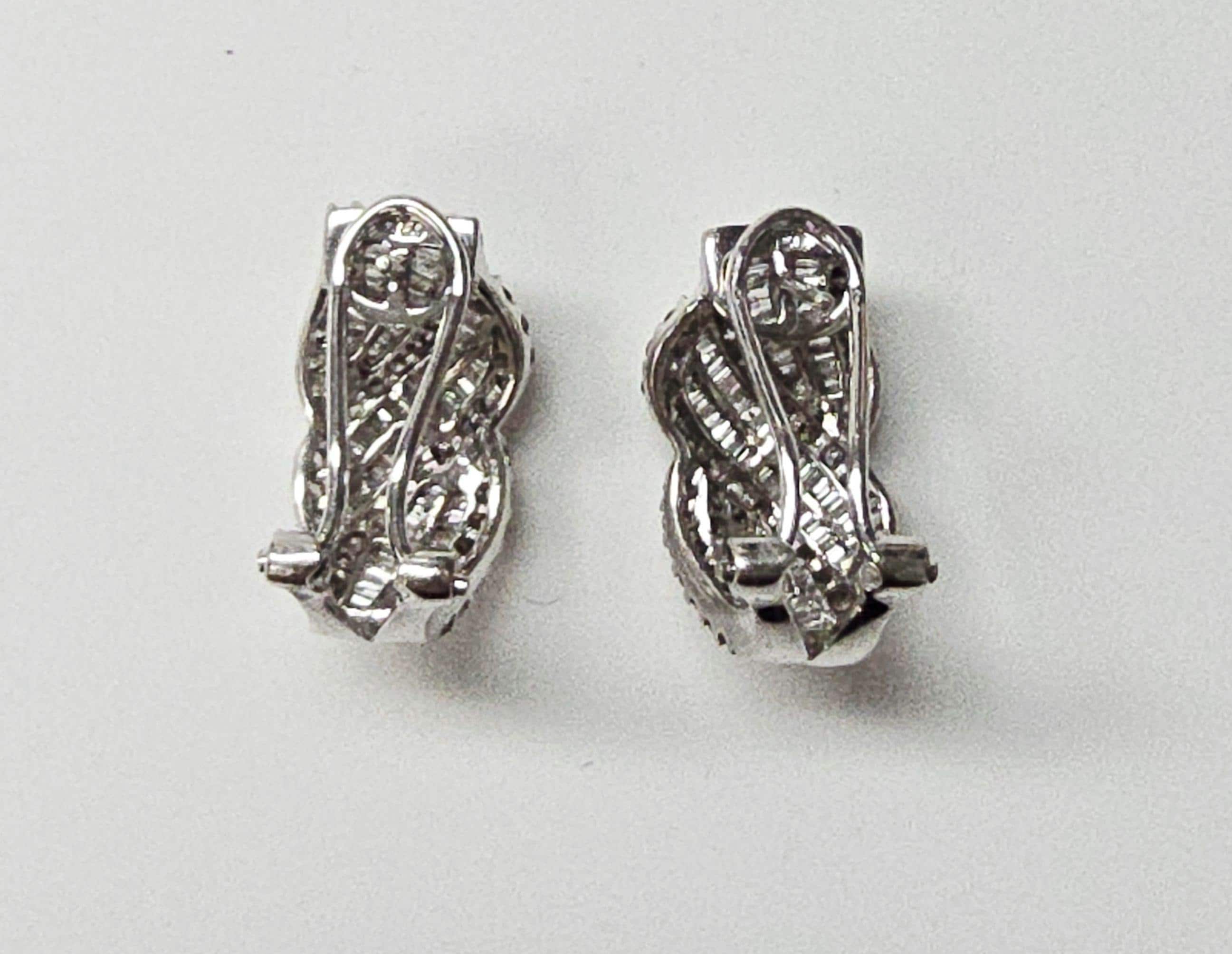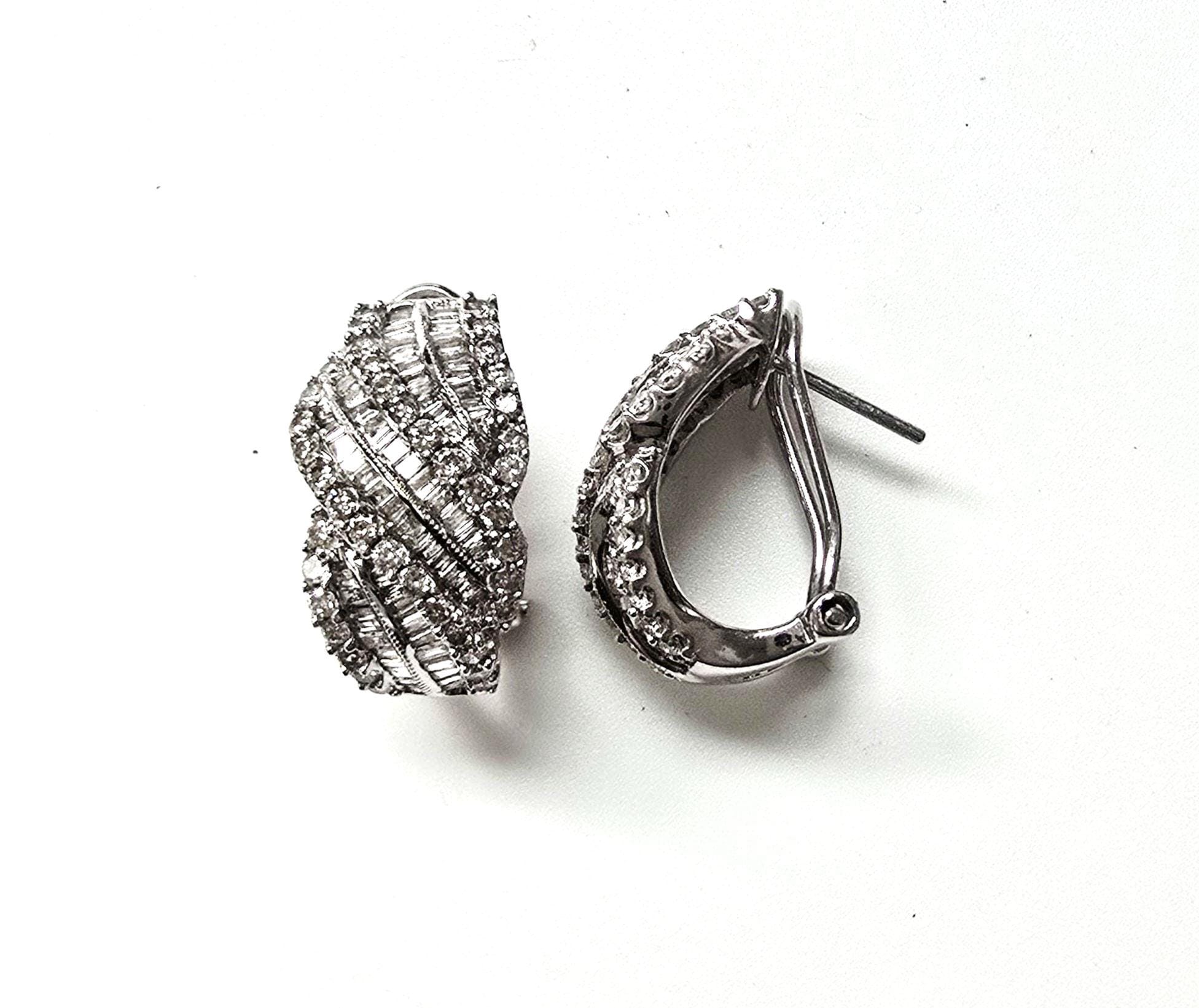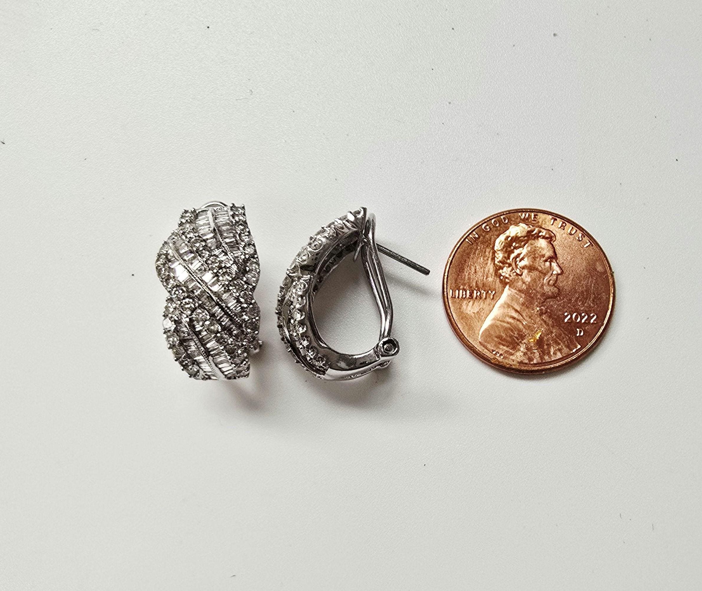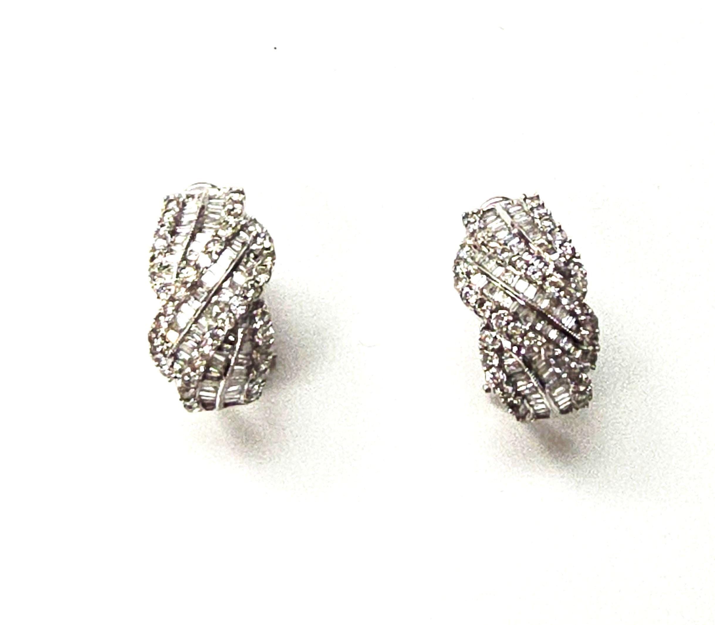 18K WHITE GOLD BAGUETTE AND ROUND DIAMOND EARRINGS WITH 2CTW OF WHITE SPARKLY DIAMONDS. EARRINGS HAVE FRICTION POSTS AND OMEGA SAFETY BACKS.MEASUREMENTS: 17MMX10MM.