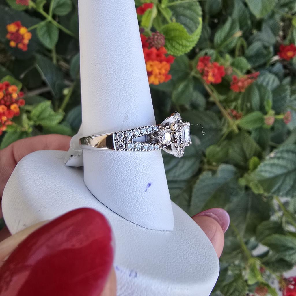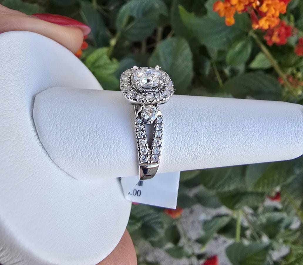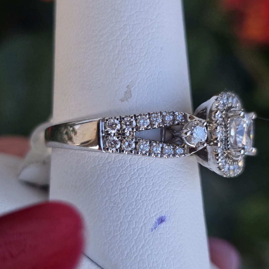 Sweet!!! This petite and detailed Cushion Cut Diamond Ring is set with a natural EARTH MINED cushion cut diamond that weighs 0.71 carats and is G, VS in diamond grading according to GSI Diamond Certification. The ring has two side stones set at the shoulders of the ring and are approximately 0.10 carats each. It also has a row of 16 diamonds set in a "Halo" or frame around the center stone and a split shank that is pave set with twelve round diamonds on each side, making the total diamond weight in the band approximately 0.75 carats. The ring is currently a finger