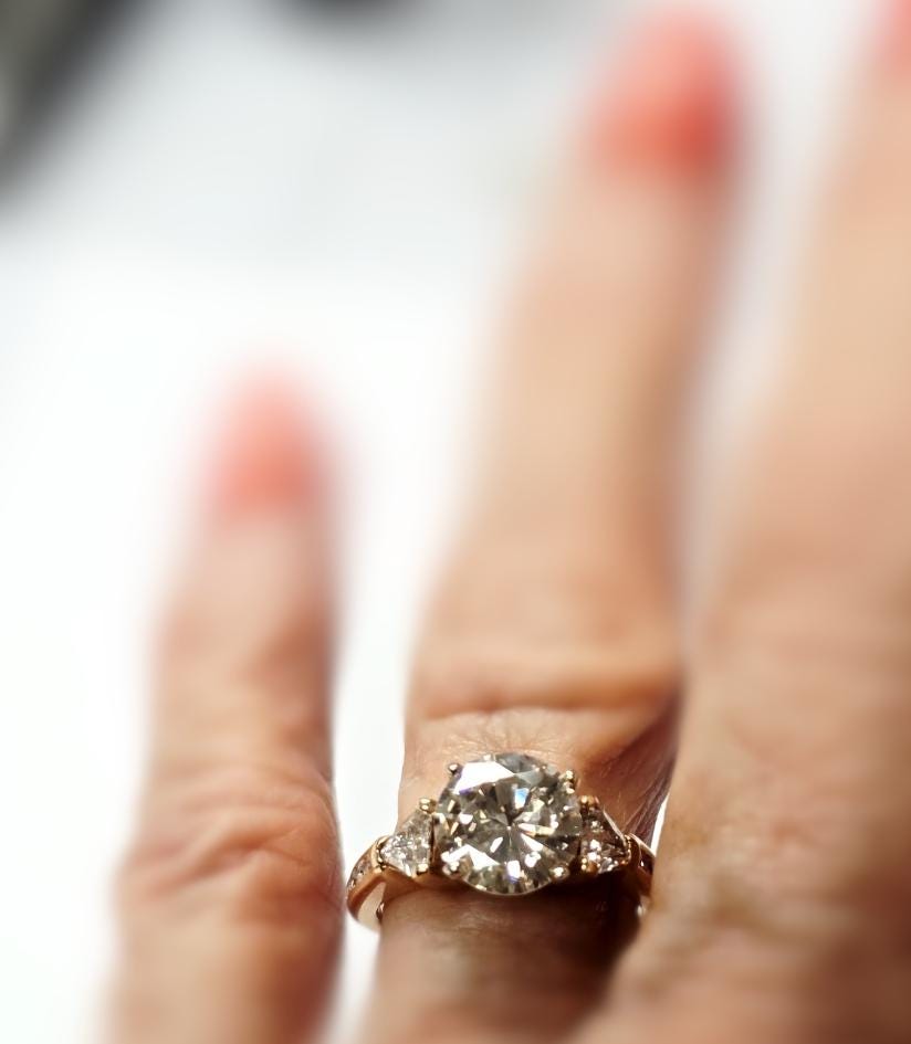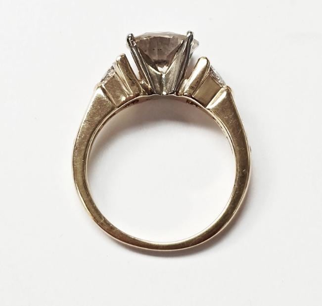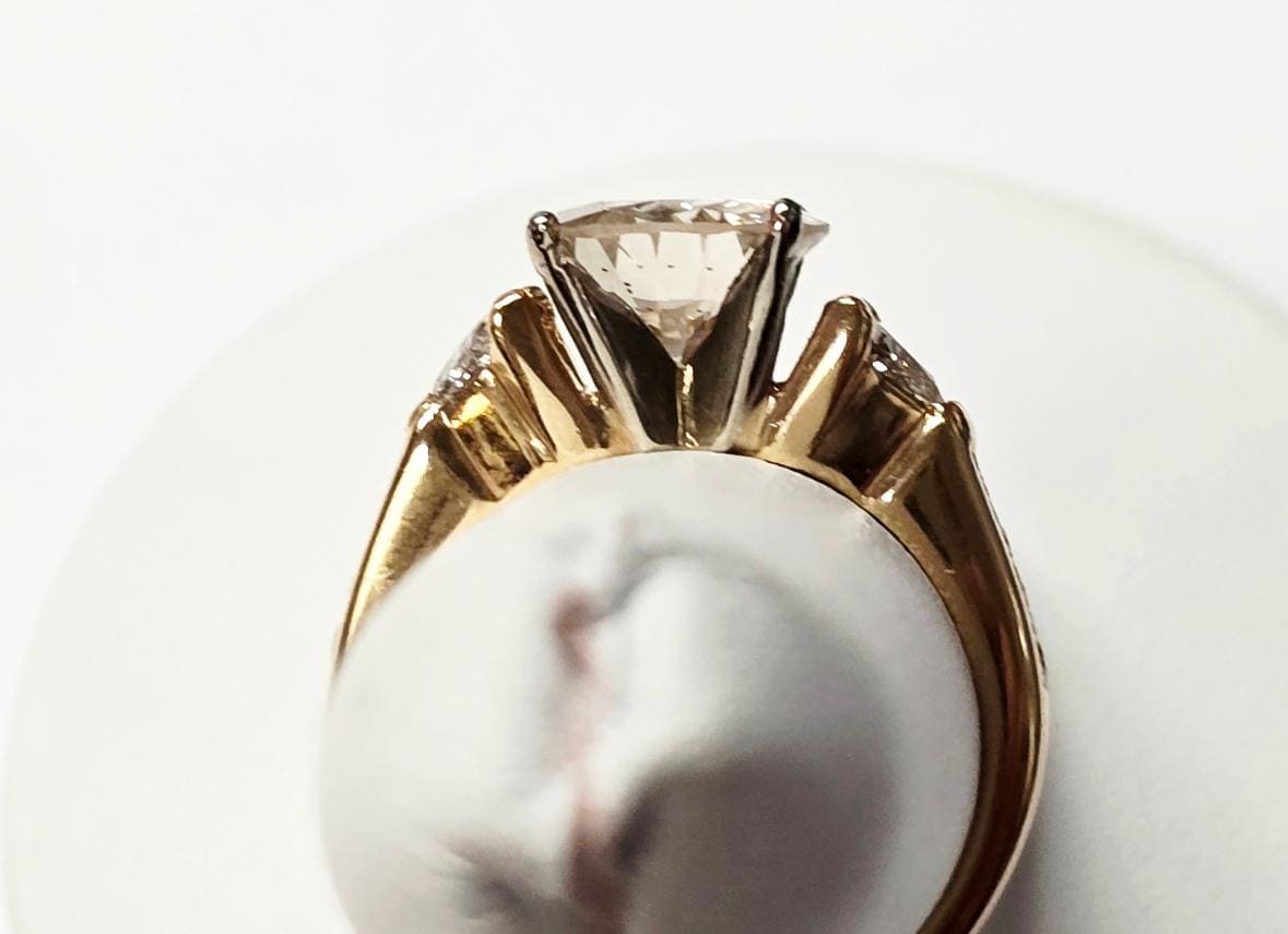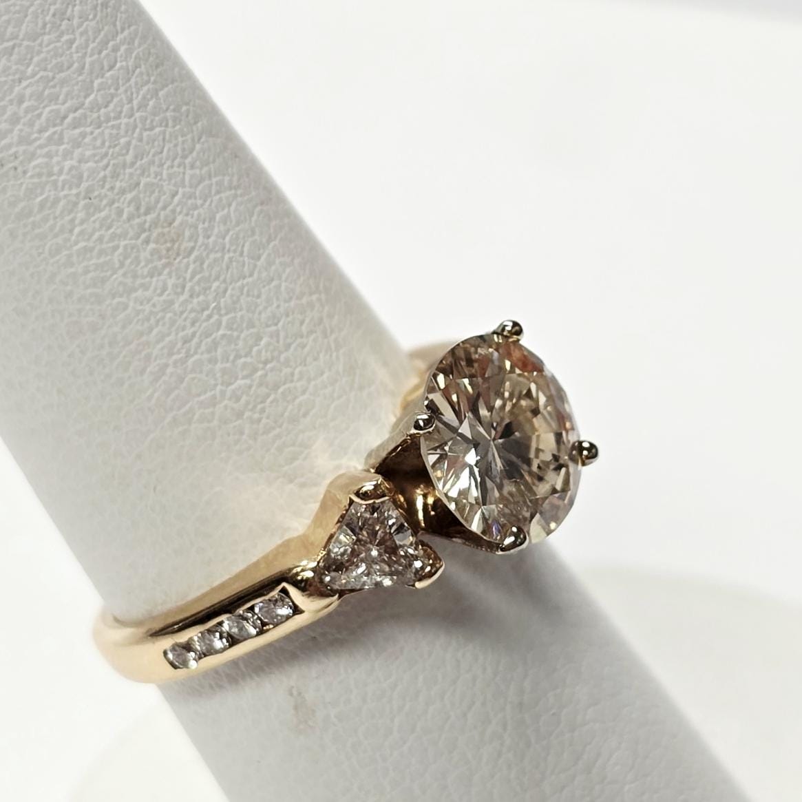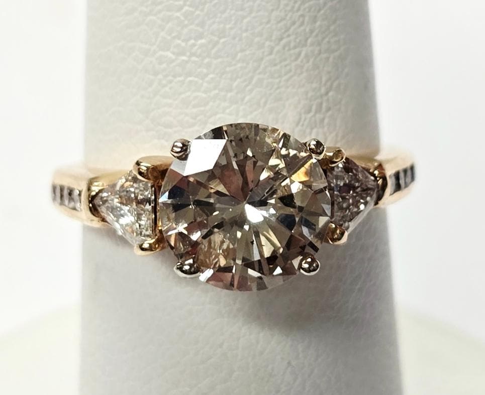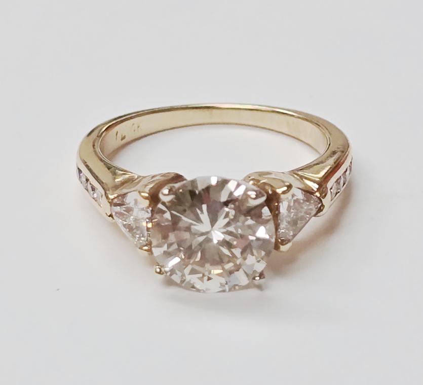 14k Yellow Gold Diamond Engagement RingCenter Diamond = 2.14ct, Trillions: 2=0.60ctw, Rounds: 8=0.15ctw Finger Size: 6