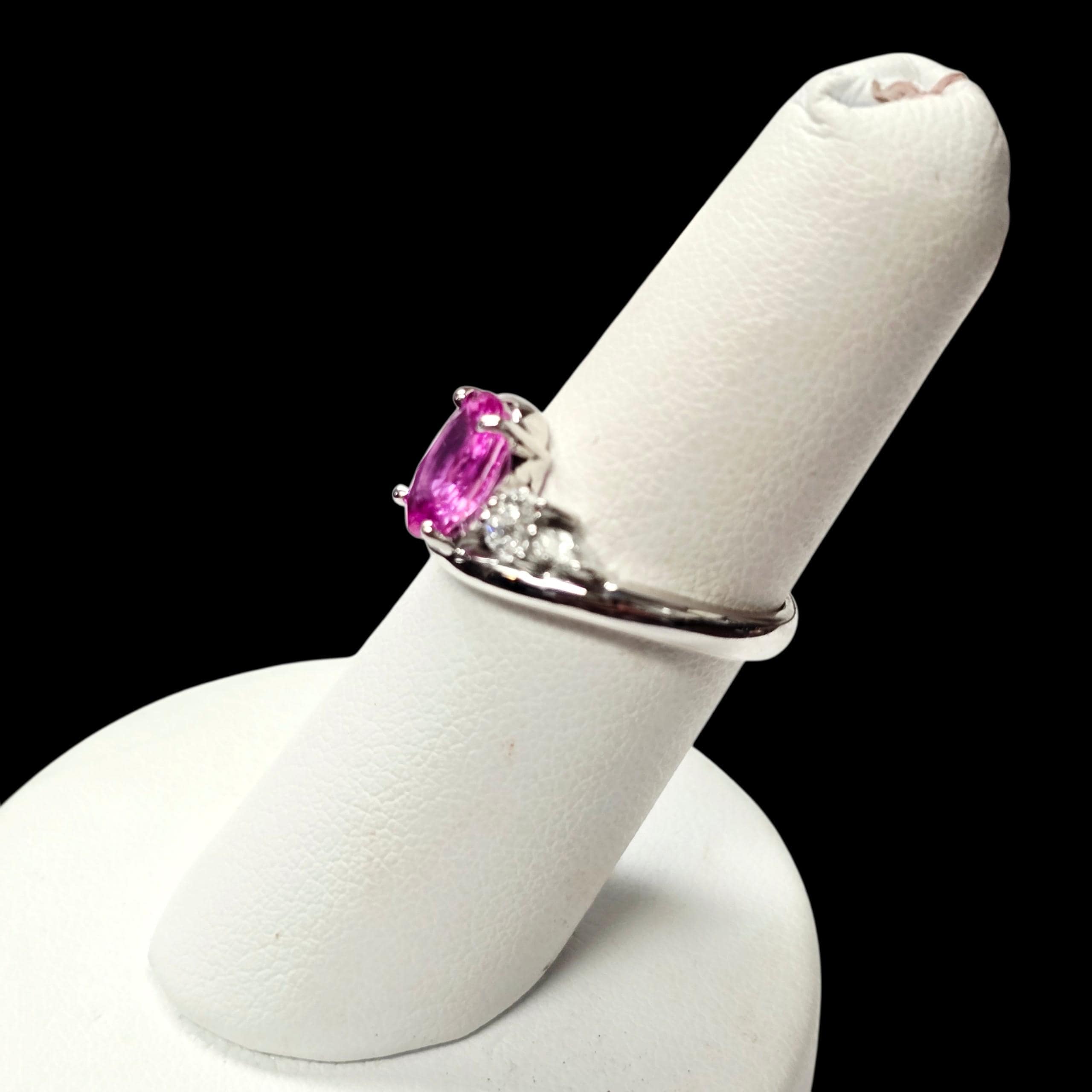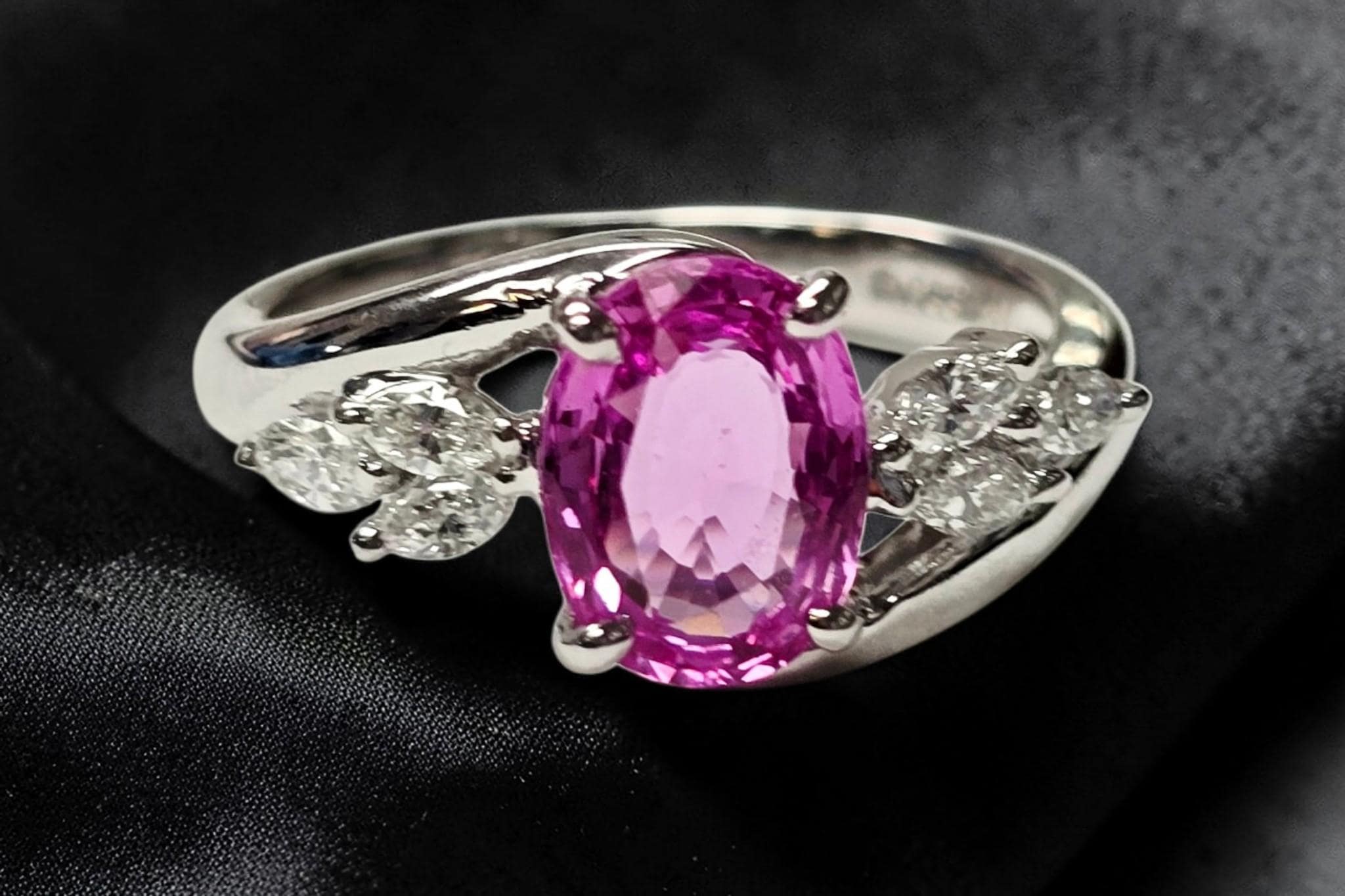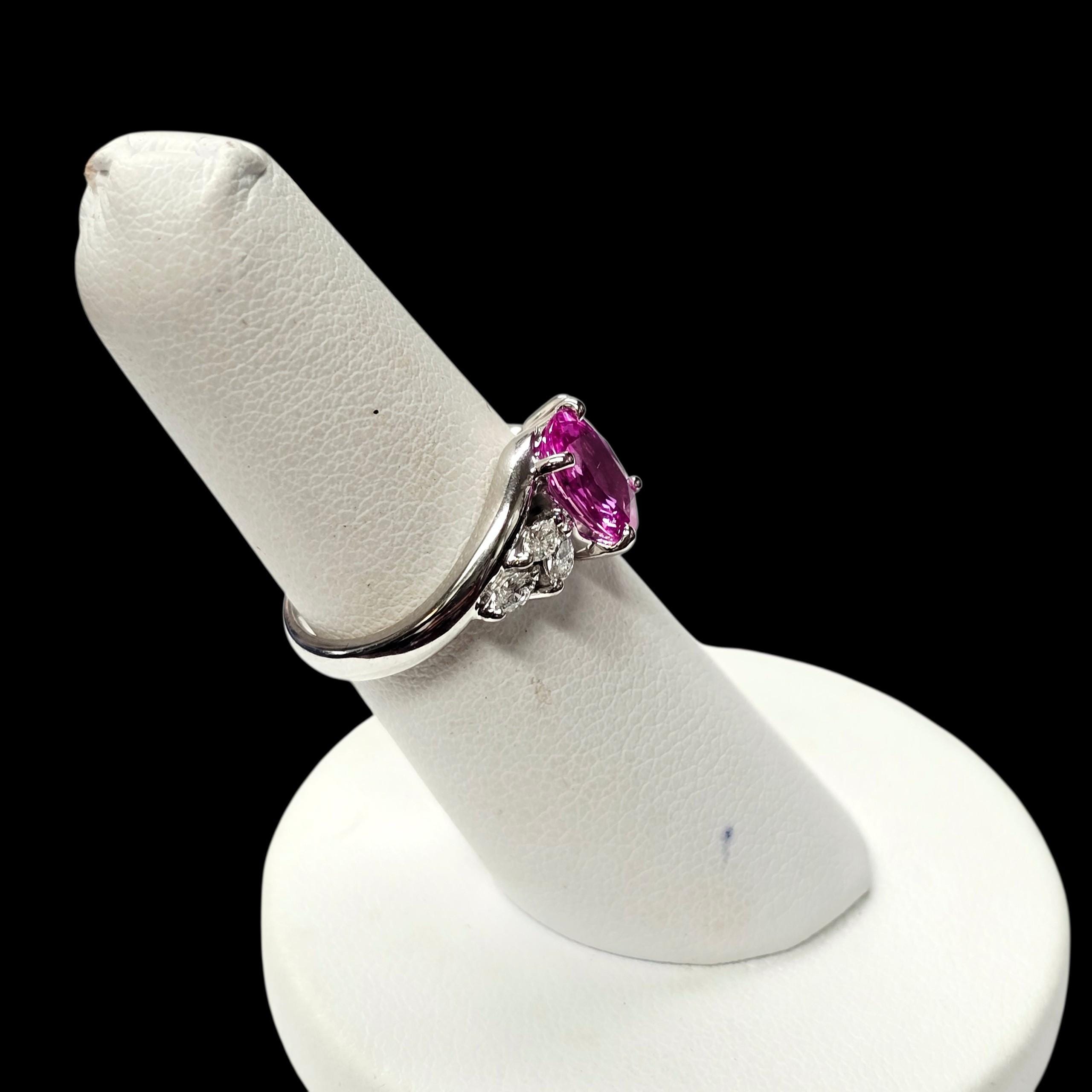 Elegant and timeless, this beautiful ring features a 1.75 carat natural pink sapphire set in a luxurious platinum mounting. Surrounding the center stone are six marquise-cut diamonds totaling 0.29 carats, adding graceful sparkle and a delicate floral elegance to the design.
