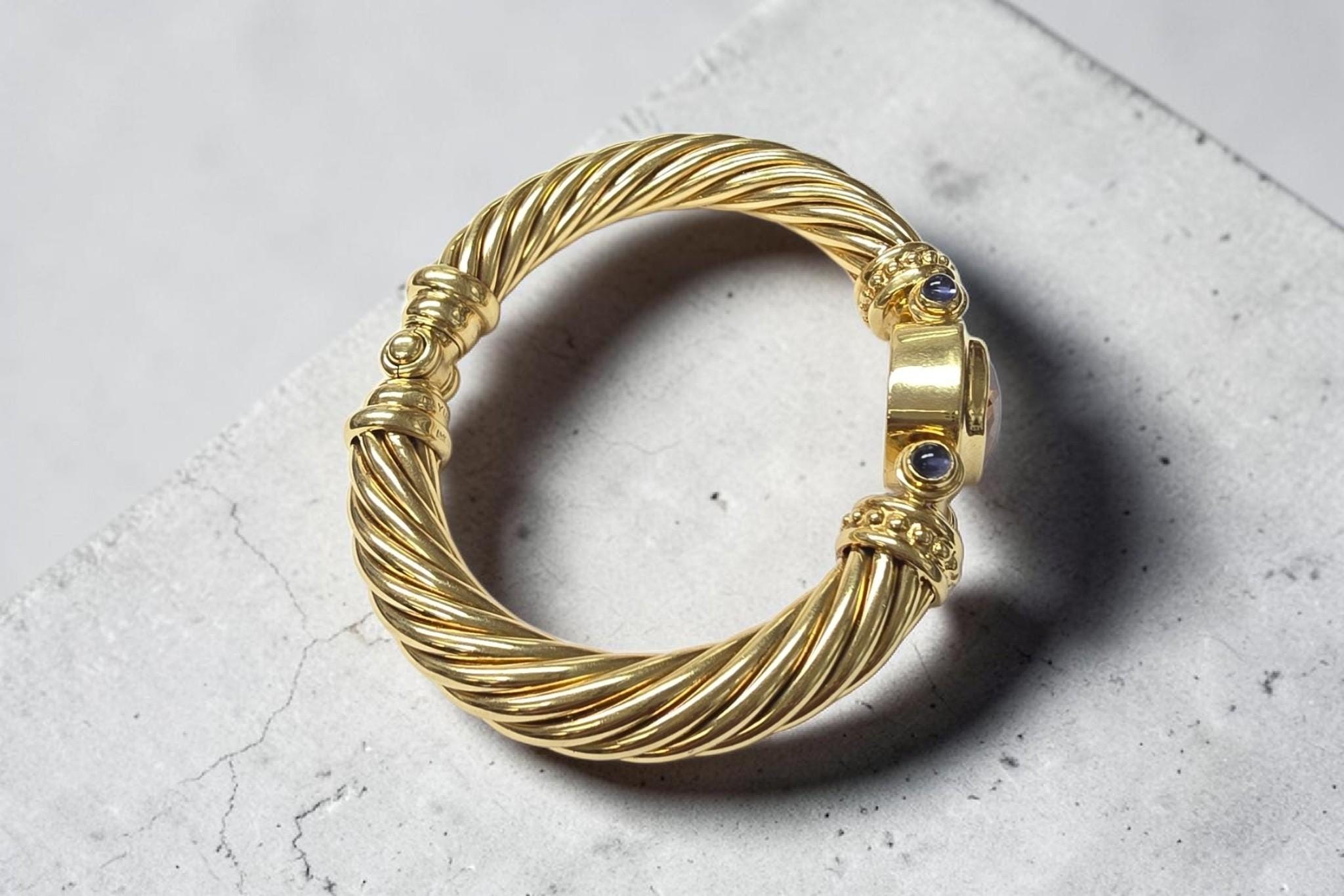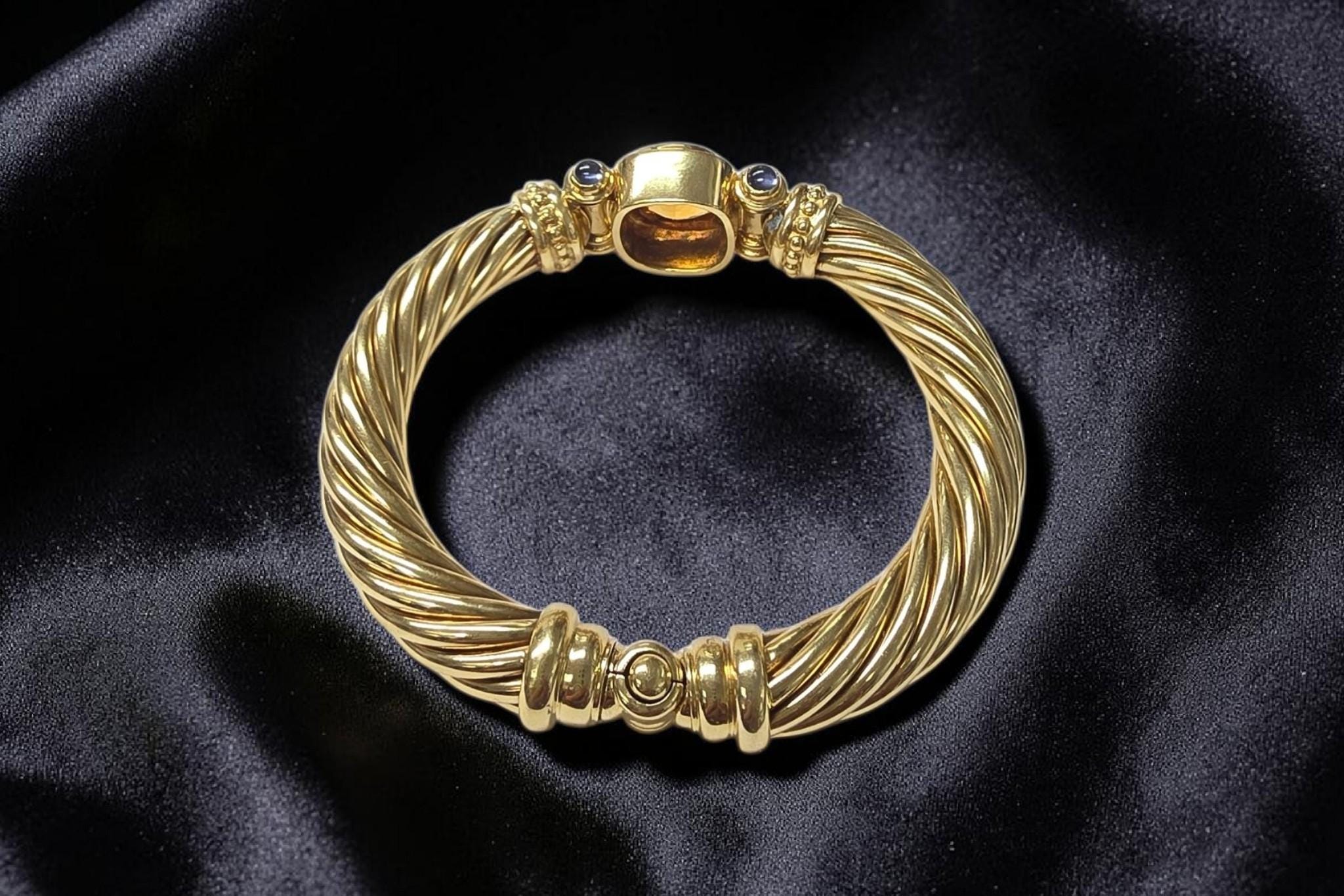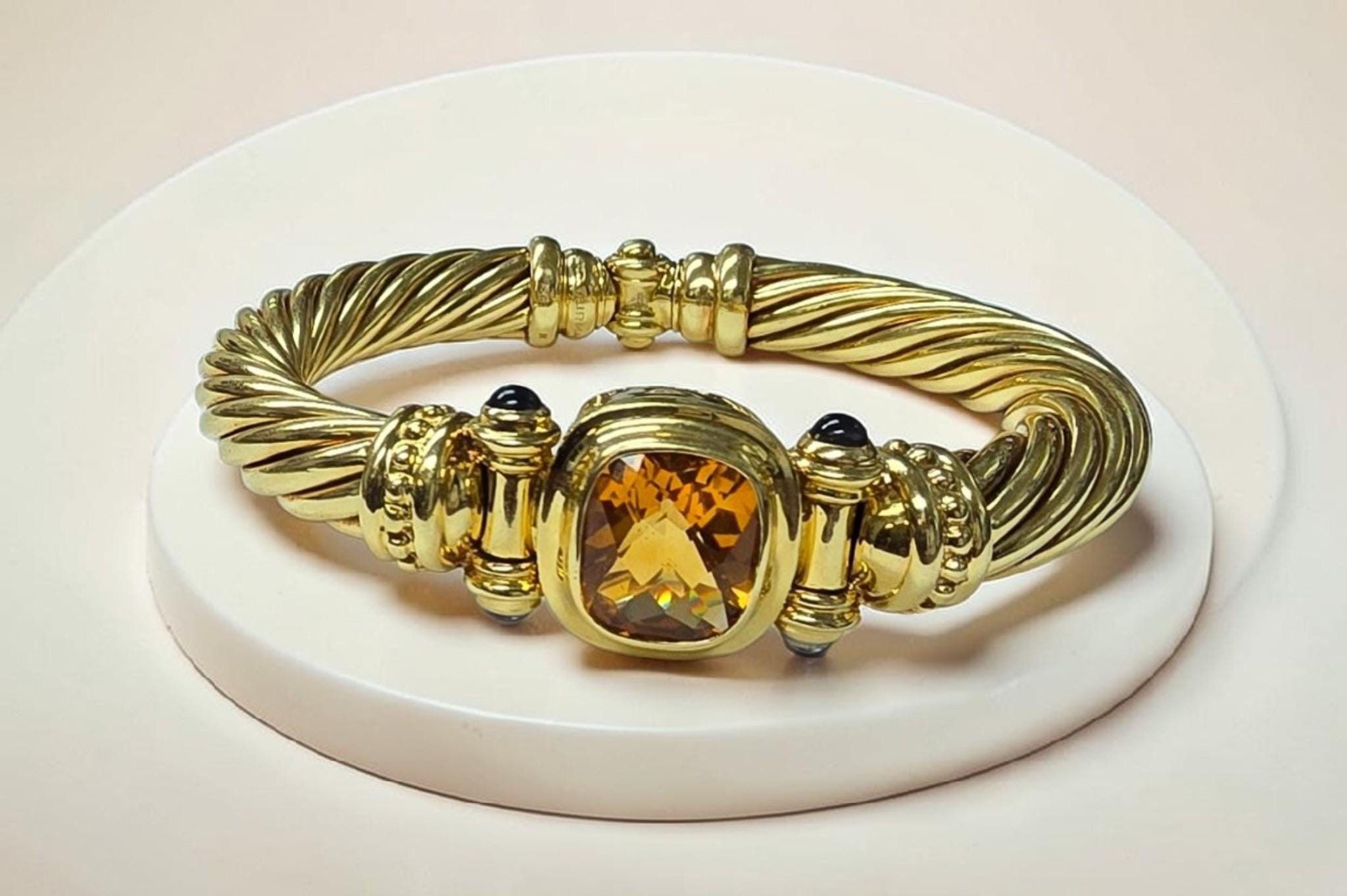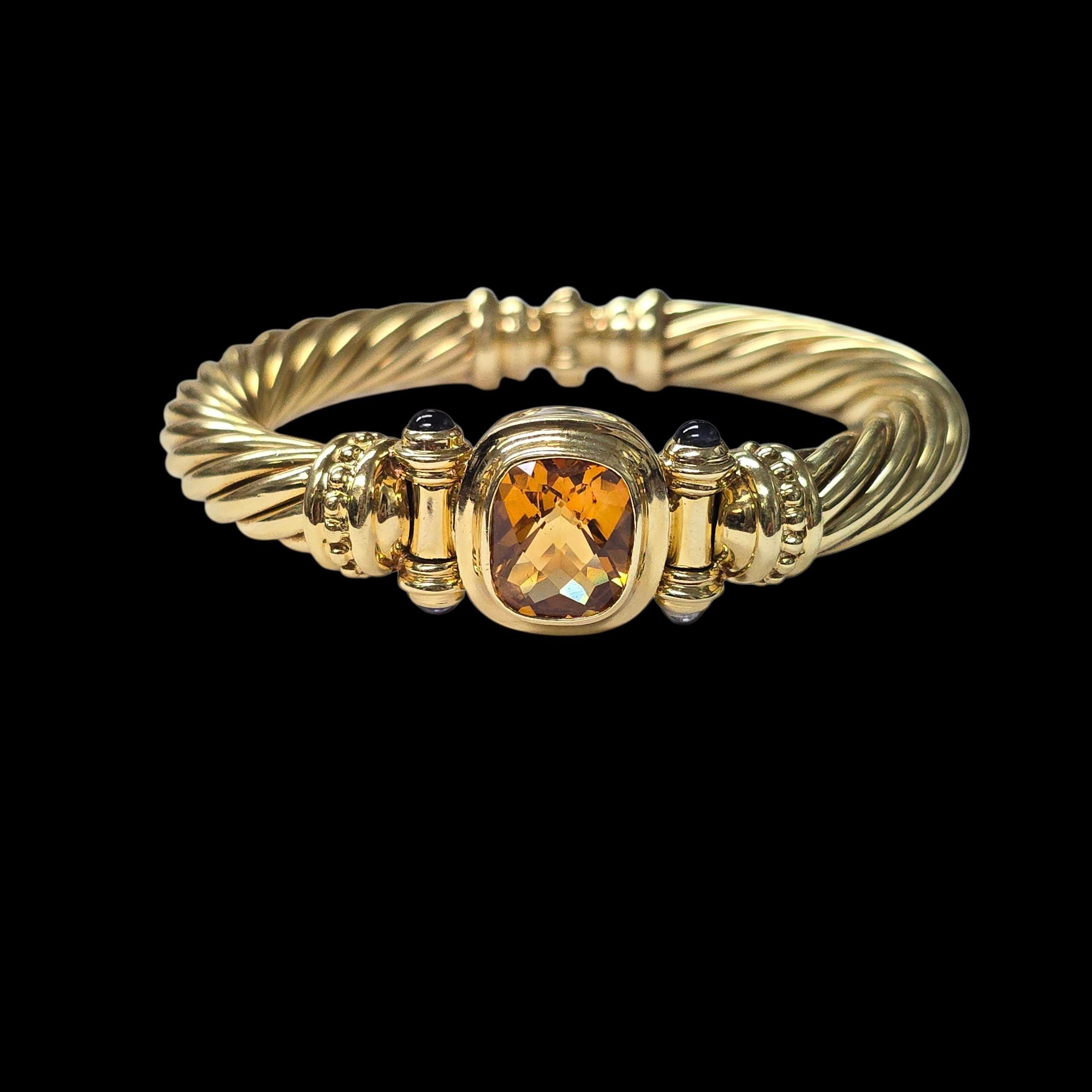 18k Ladies Yellow Gold "David Yurman" Twisted Cable Bangle Bracelet with Center Cushion Cut Citrine gemstone in the center and 4 Iolite cabochon gemstones set into the 4 end caps. The bracelet weighs 61.0 grams.